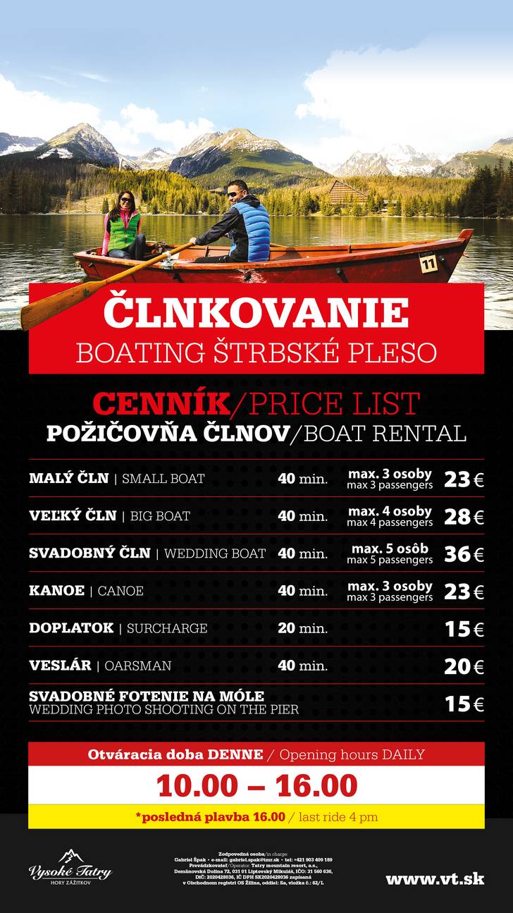 K dispozícii je 22 člnkov, ktoré sú pristavené v novovybudovanom móle s prekrásnym výhľadom na tatranské končiare. Výnimočným zážitkom môže byť i možnosť využitia služieb súkromného veslára.