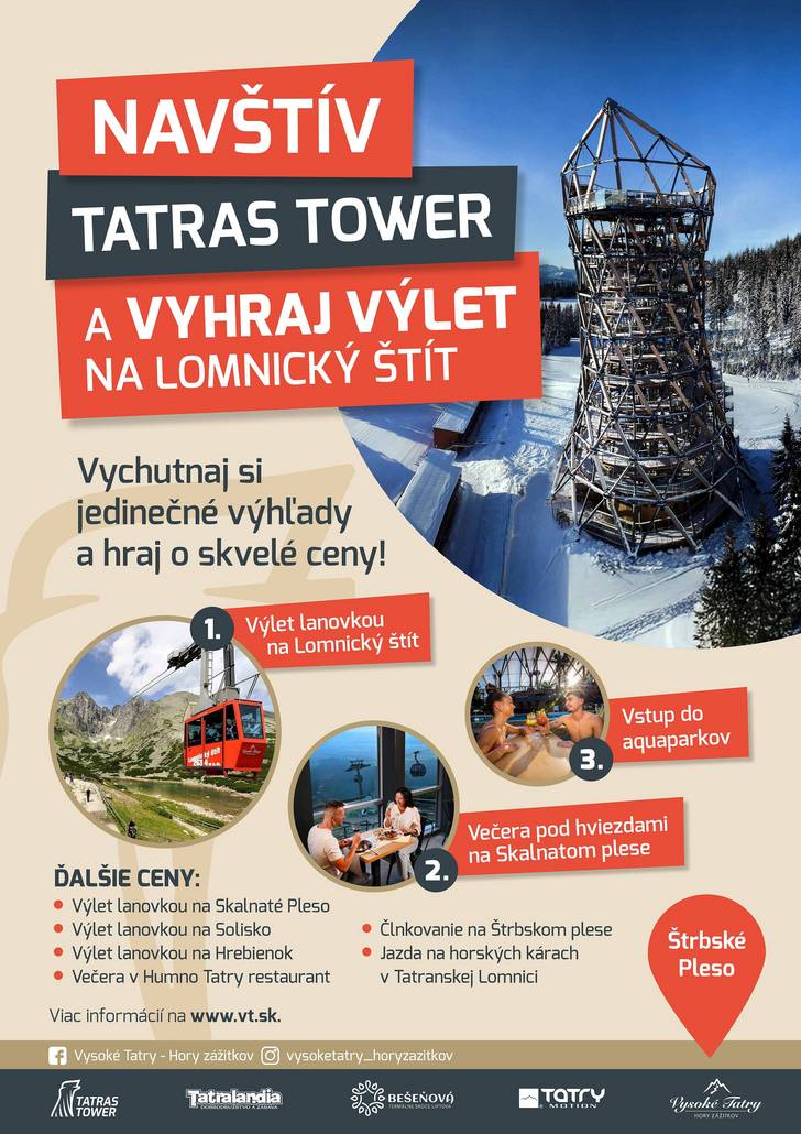 Navštív Tatras Tower na Štrbskom Plese kedykoľvek do 30.4.2026. Ku lístku dostaneš hraciu kartičku, ktorú vyplnenú následne vhoď do hracej urny v Tower Café & Shop. Žrebovanie cien prebehne 3.5.2026. Všetky ceny sú platné v letnej sezóne 2026. Zmena cien vyhradená.