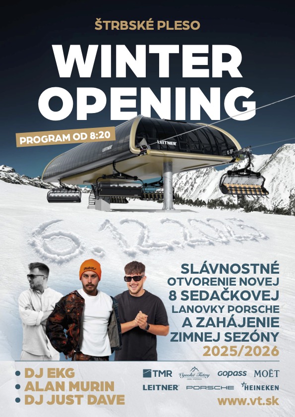 8:20 – Slavnostní otevření nové 8sedačkové Porsche lanovky na Medvědí kopu. Společně si připijeme a pokřtíme novou lanovku na Štrbském Plese!